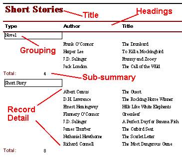 The image above shows the main parts of a report. The information on a report can be sorted and grouped by fields. The report above is grouped by type of story (Novel or Short Story) and sorted by author. The report above also has sub-summaries. When a grouping option is used, sub-summaries can be specified for each group.