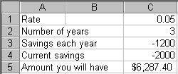 You start increasing the value of C3 until the value in C5 is greater than $8500. Doing this you discover you will have to save almost $1900 each year: