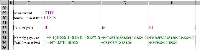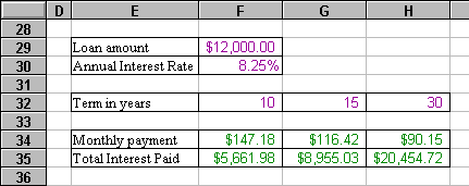 Here is a simple spreadsheet showing the effect of varying loan terms on a $12,000 loan with an interest rate of 8.25%. This spreadsheet contains three distinct kinds of information: