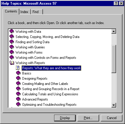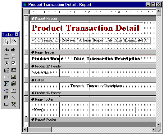 A report definition is divided into sections. Sections determine where information will appear on the report. The contents of a report are specified by controls. A control may be a label, calculated field, decorative line, or field from a table or query.