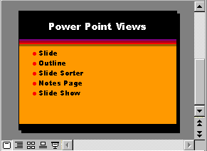 | Slide Sorter View shows a thumbnail image of each slide in your presentation. This view is best when you want to rearrange the order of your slides or just want to see each slide in your presentation with the formats and colors you have chosen. In Slide Sorter View you can't edit the contents of a slide, but you can quickly switch to Slide View were you can edit the contents. |