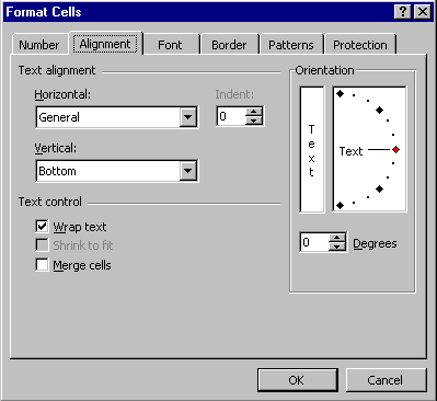 Another option for displaying text values that are longer than the cell width is to use Wrap text. Wrap text is an option available from the Alignment tab on the Format/Cells... menu: