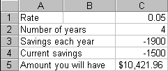 Here's how you could use a spreadsheet like the one above to help you make a decision. Let's say you would like to take an around-the-world cruise. The cost is $8500. You have $2000 in the bank now but are thinking of spending $500 of that on a trip to Branson this year. To get started you enter the following into Excel: