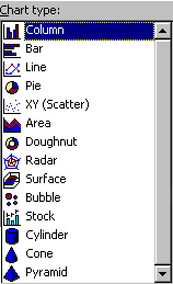 For more information about each chart type, including when to use a particular type, please refer to the on-line help sytem. Select Contents and Index from the Help menu, and then search the Index for chart types, examples.