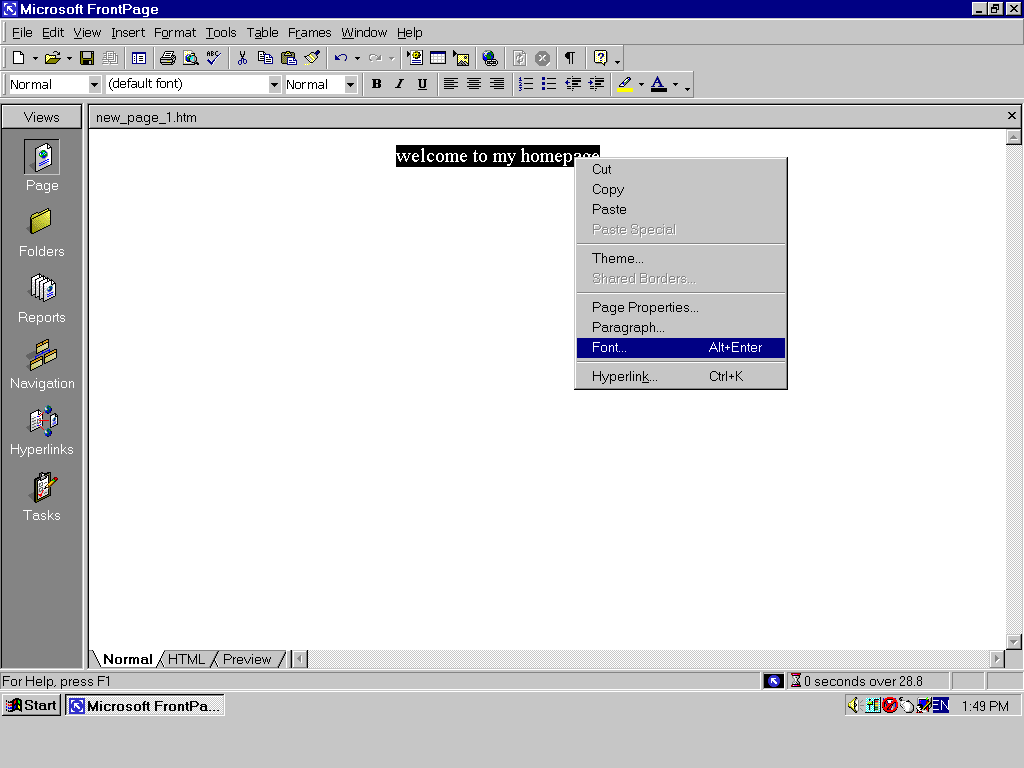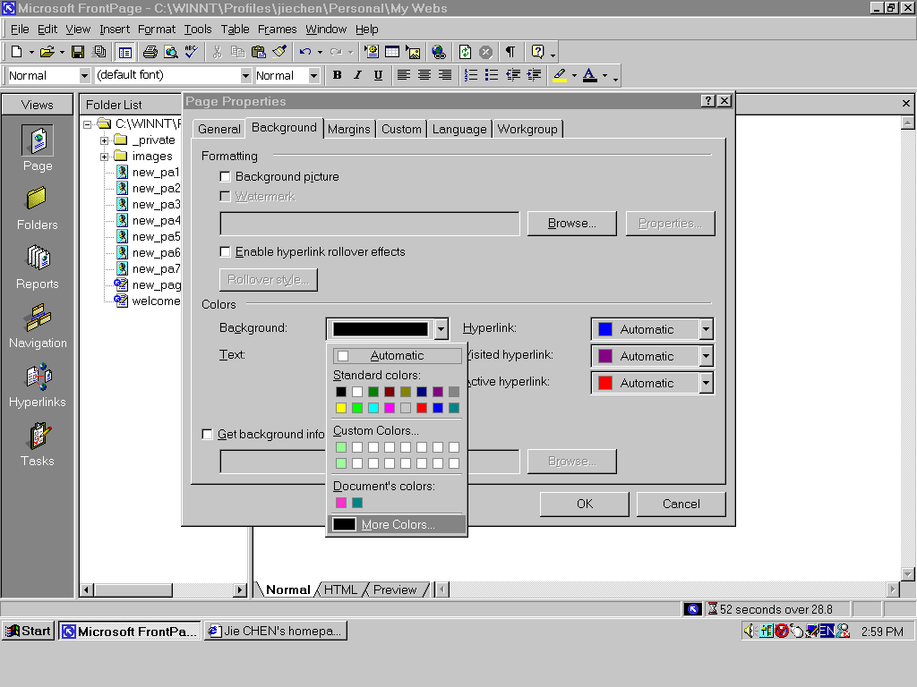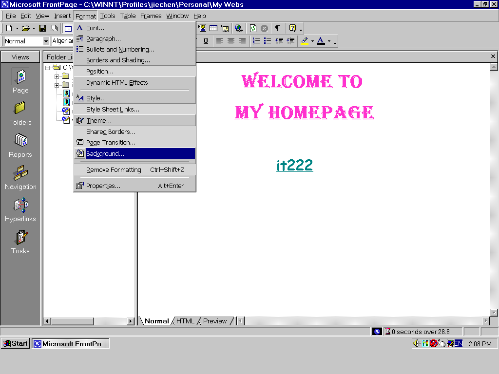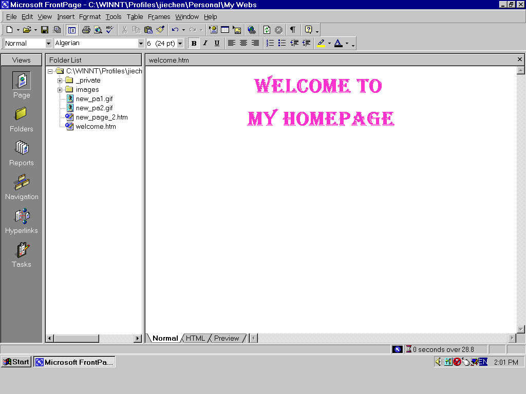 Normally, when you open a frontpage2000 software, you will see this window below. As a beginner, you should know how to use these functions in views window. The default function is Page (see left side of this window). when you begin to edit a page, please make sure to use normal which is one of three statuses (normal, html, preview, see button of this window) ,