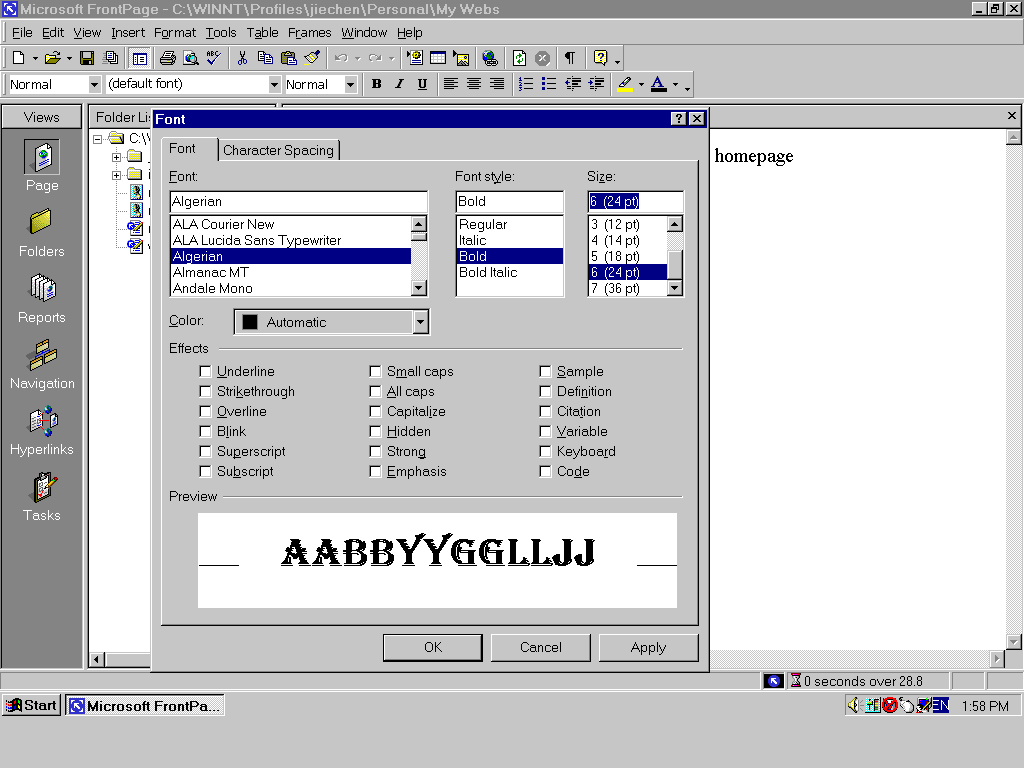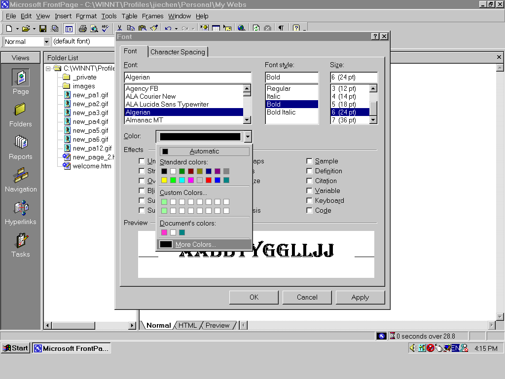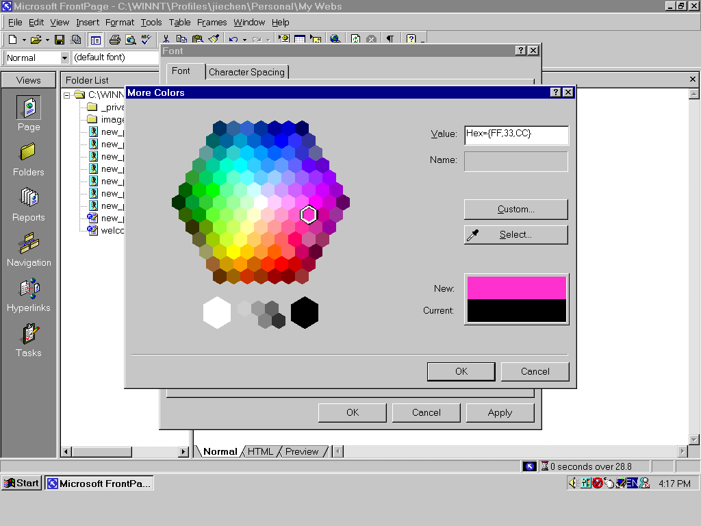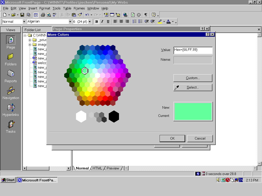 Normally, when you open a frontpage2000 software, you will see this window below. As a beginner, you should know how to use these functions in views window. The default function is Page (see left side of this window). when you begin to edit a page, please make sure to use normal which is one of three statuses (normal, html, preview, see button of this window) ,